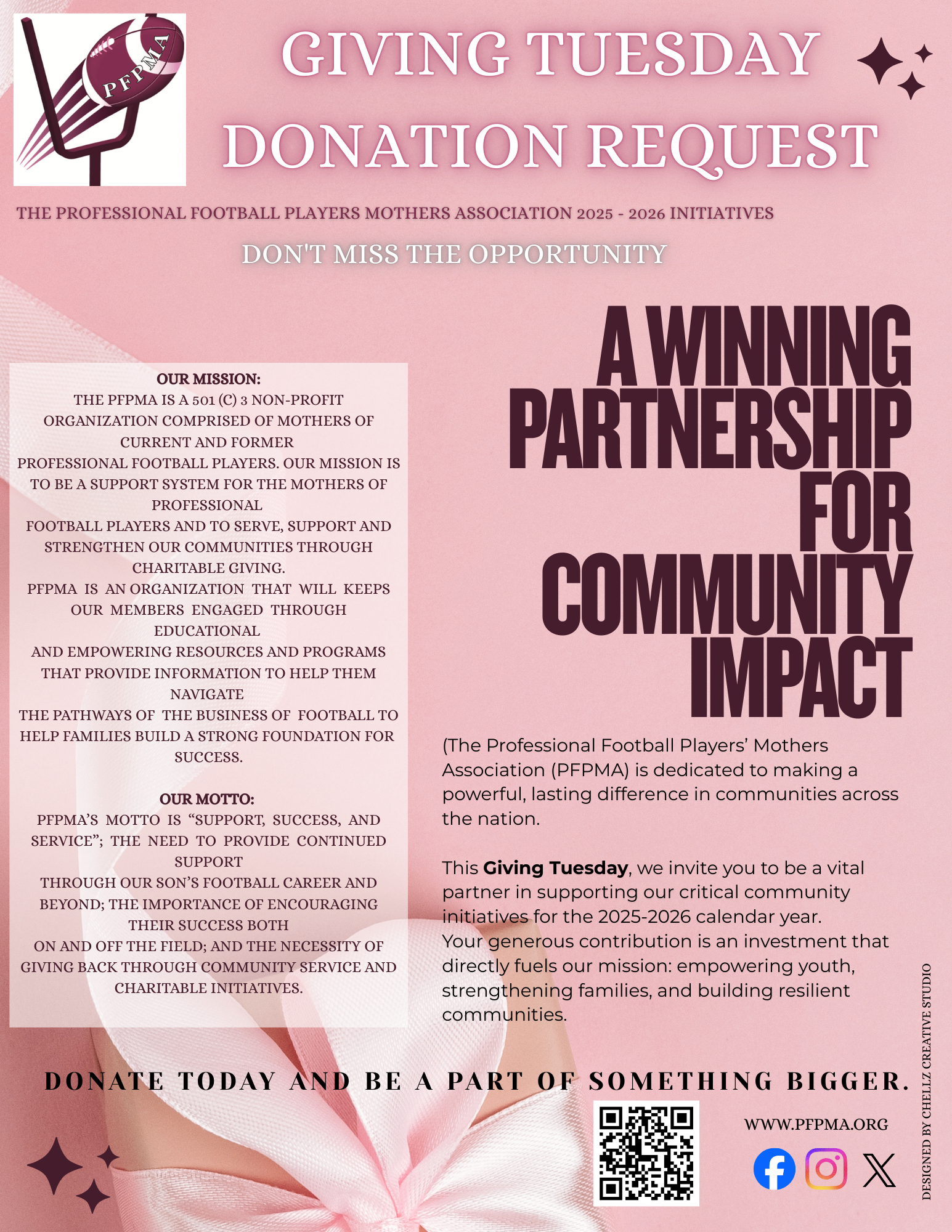 Who We AreThe Professional Football Players Mothers Association (PFPMA) is a national 501(c)3 nonprofit organization. We are comprised of phenomenal mothers, or those who serve that role in a player's life, of active and retired professional football players. We are here to create a support system and information network by providing a membership association that address the needs and concerns that are specific to the business of professional football. PFPMA is an organization that will keep you engaged through educational and empowering resources and programs that provide information to help you navigate the pathways of the business of football to help families build a strong foundation for success. Our mission is to serve, support, educate, and strengthen our communities through charitable giving. |